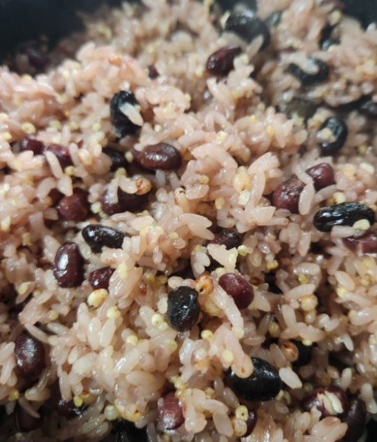 - 밥 짓기: 전기밥솥에 불린 쌀, 콩, 수수, 기장, 삶은 팥과 밤을 넣고, 물 2컵과 팥 삶은 물 1컵을 부어줍니다. 소금 1작은술을 넣어 간을 맞춘 후, 전기밥솥의 잡곡밥 모드로 취사합니다.