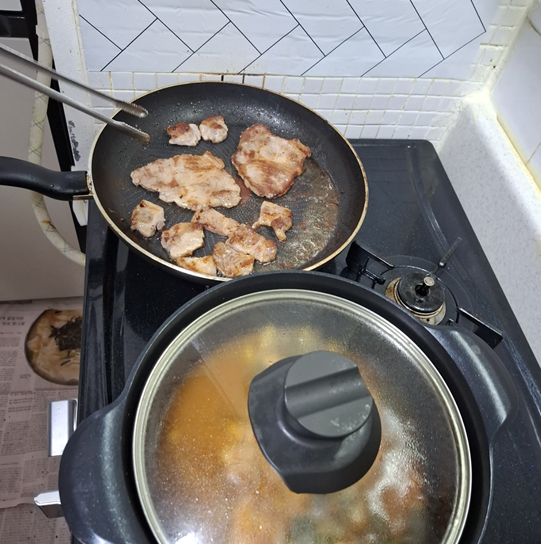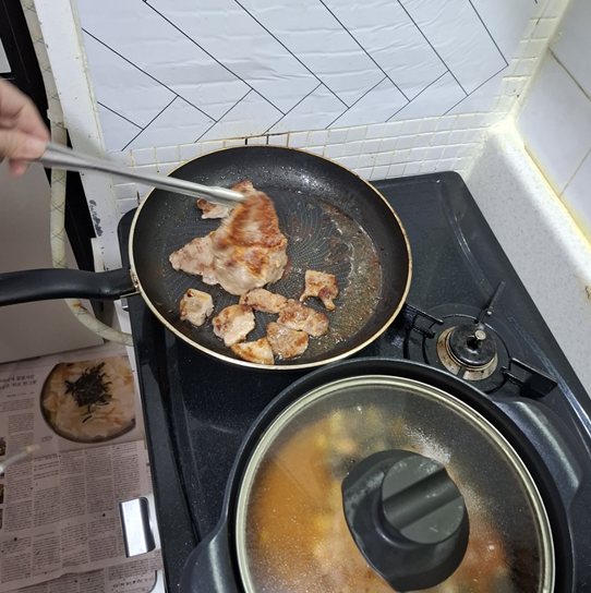 ✔ 팬을 달군 후 기름을 살짝 두르고, 중불에서 목살을 굽기 시작해요.