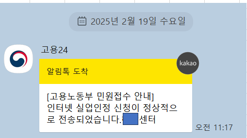 ✔ 실업급여 신청이 정상적으로 완료되면 카카오톡 또는 문자 메시지로 접수 완료 알림이 옴