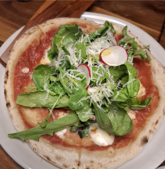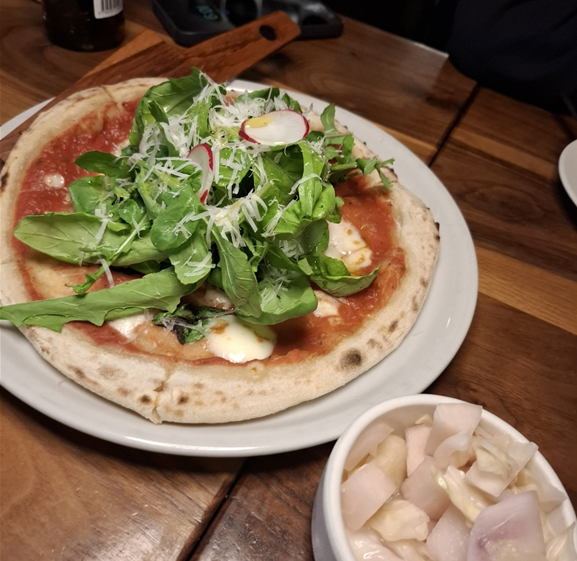 우드그린은 화덕에서 구운 씬피자가 정말 맛있기로 유명해요. 피자를 주문하면 얇고 바삭한 도우에 진한 치즈와 신선한 토핑이 어우러진 피자가 나와요.