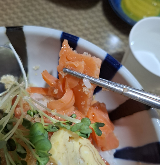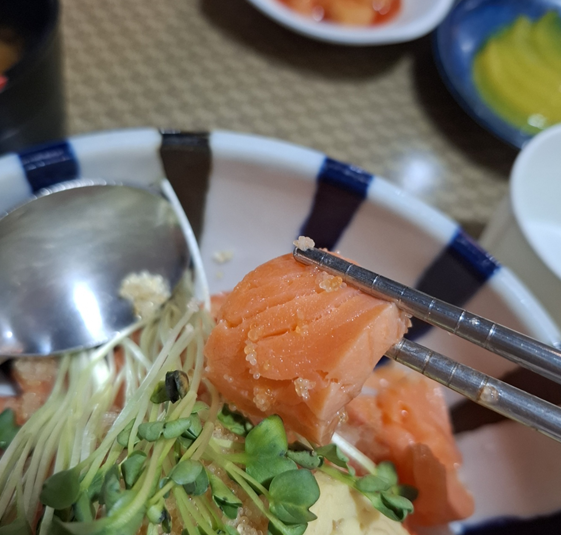 ✔ 밥 위에 연어를 얹고 고추냉이를 살짝 올려 먹으면 연어초밥 못지않은 맛