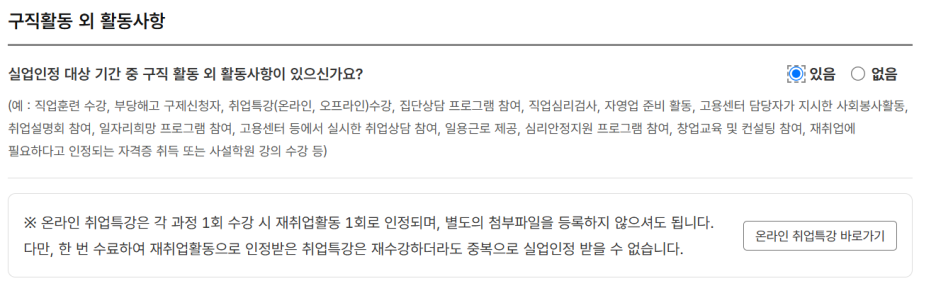 ✔ 구직활동을 인정받기 위해 이력서 제출, 면접 참석, 온라인 특강 등을 활용