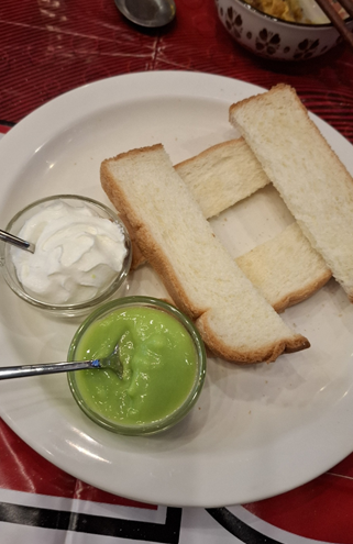 식사 후 디저트로 선택한 판단빵은 초록빛을 띠는 독특한 비주얼이 먼저 시선을 사로잡았어요. 겉은 부드럽고 안은 은은한 단맛이 배어 있어, 한국 빵과는 또 다른 매력이 있었습니다. 이어 등장한 고수 바닐라 아이스크림은 특히 인상 깊었어요.